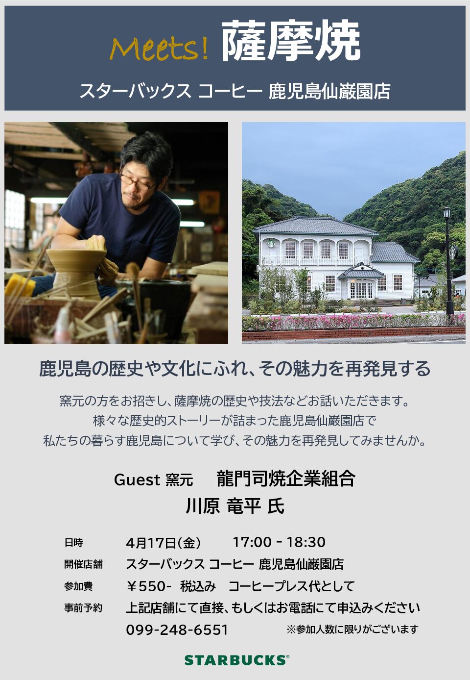 恒例となりました! スターバックスコーヒー鹿児島仙巌園店で、プレスコーヒーをいただきながら、鹿児島の歴史や文化にふれ、魅力を再発見するイベント「Meets!薩摩焼」。4月は陶工・川原竜平がお邪魔して、...